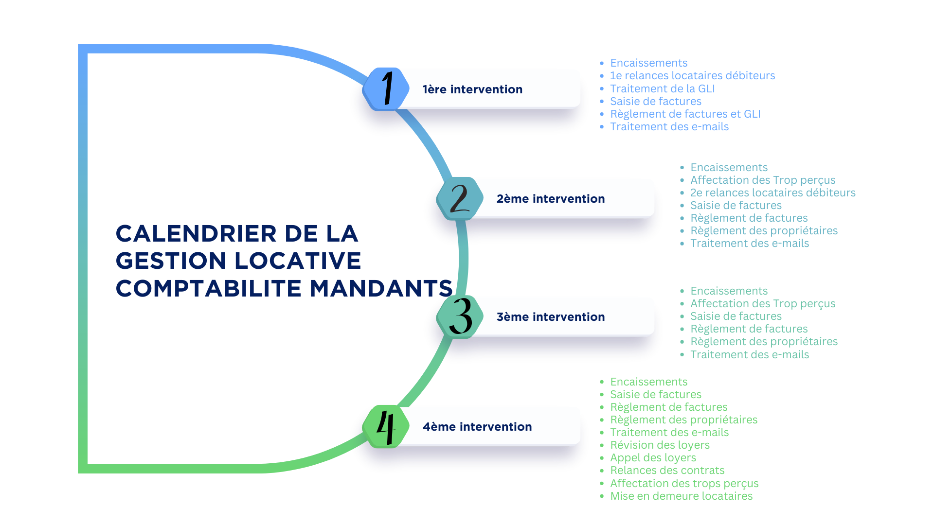 Chaque intervention couvre les principales opérations de la gestion immobilière.